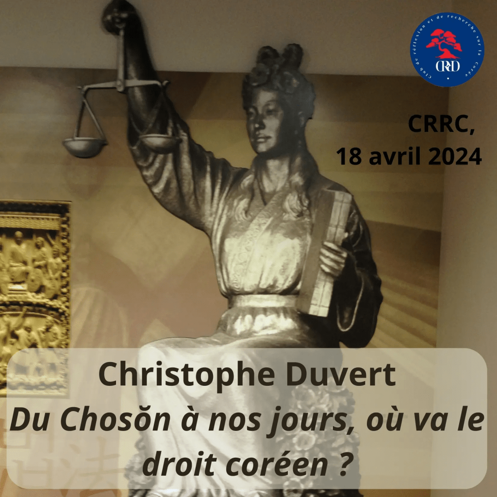 Dans cette présentation Christophe Duvert aborde le sujet de la construction du droit coréen à travers l’histoire juridique du pays en soulignant les emprunts à et l’influence exercée par les droits d’autres systèmes juridiques, notamment asiatique, européen et américain tout en considérant ses caractéristiques propres et ses transformations jusqu’à aujourd’hui.