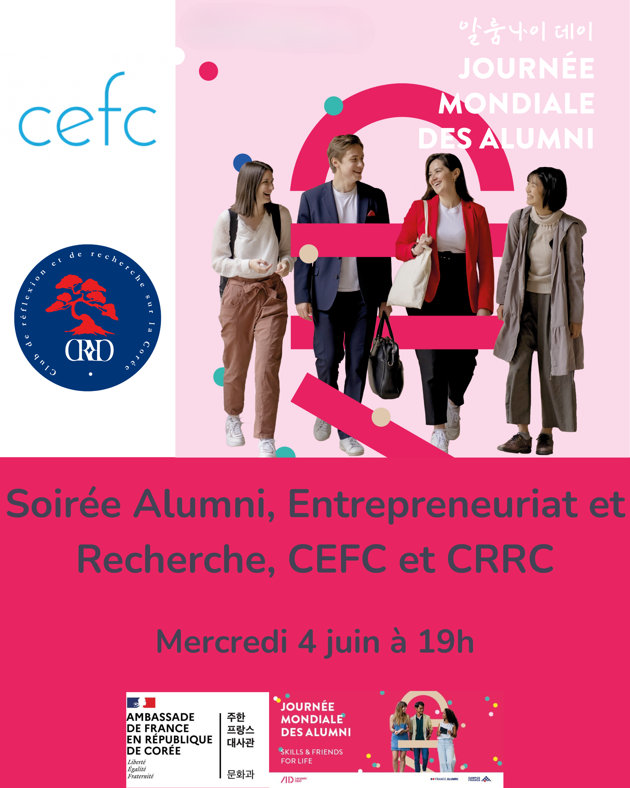 La soirée « Alumni, Entrepreneuriat & Recherche » coorganisée par le Club de Réflexion et de Recherche sur la Corée (CRRC) et le Cercle des Entrepreneurs Francophones en Corée (CEFC) a eu lieu le mercredi 4 juin 2025.